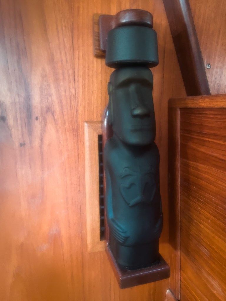 Finally, we also celebrated Ian’s completion of a circumnavigation. One way of looking at a circumnavigation is going around the world but you can spiral, climbing the latitudes and never cross your path. Another way of looking at it is when you “cross a path”. He sailed around the world but hadn’t ended up in any of the same places twice until we arrived in Cartagena. We had a drink of pisco from the Easter Island Maoi bottle that is mounted on the wall of the boat that Ian got in 2007. This bottle has yet to complete its own circumnavigation.