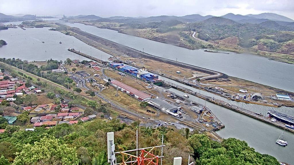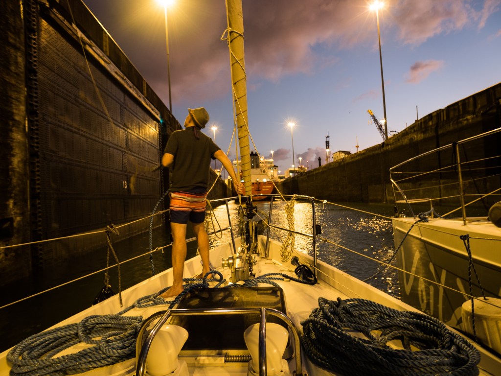 Before entering the locks, we rafted to two other sailboats. It was late afternoon, and we’d be going through the first three locks of the Canal in the evening, arriving at Gatun Lake, an artificial lake flooded to save on additional Canal construction. And the following morning, we crossed the lake and start the 23 metre descent to sea level through the final three locks, arriving in the evening on the other side. A different pilot–a guy to give Ian direction–joined us each day, and we hired one line handler, Omar, to help with the lines that get thrown to us by the guys on Canal wall. We tie these lines to the boat and our boat is held in place while the water swirls into (or out of) the lock. Then once up (or down) a level, the doors at the opposite end open, we release the lines, and we motor to the next lock.